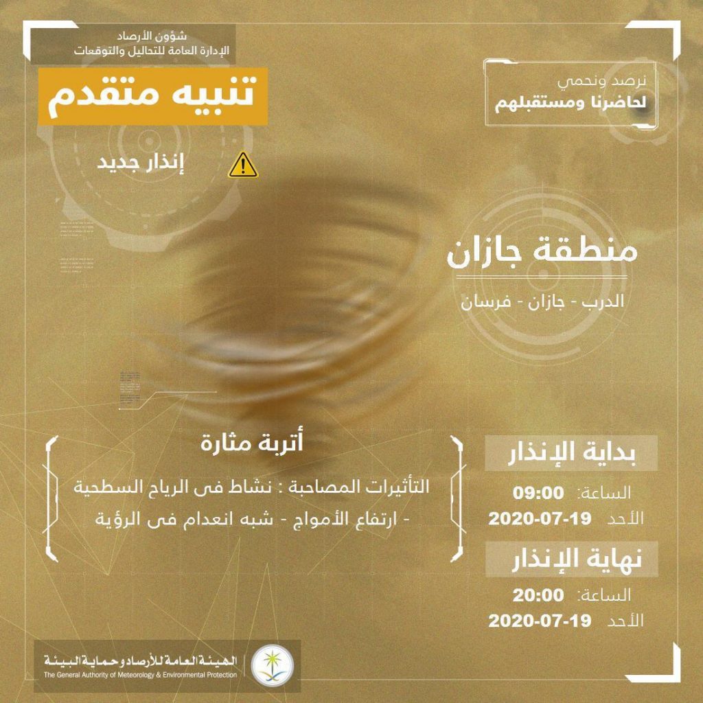 دعت مديرية الدفاع المدني بمنطقة جازان المواطنين والمقيمين إلى أخذ الحيطة والحذر لورود تنبيه متقدم من الهيئة العامة للأرصاد وحماية البيئة بهطول أمطار على منطقة جازان والمحافظات التابعة لها من متوسطة الى غزيرة تستمر حتى مساء اليوم الاحد وما يصاحبها من تأثيرات مصاحبة ونشاط بالرياح السطحية وارتفاع في امواج البحر مع اتربة مثارة وتدني وشبه انعدام في مدى الرؤية .