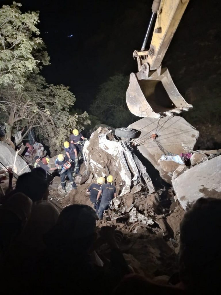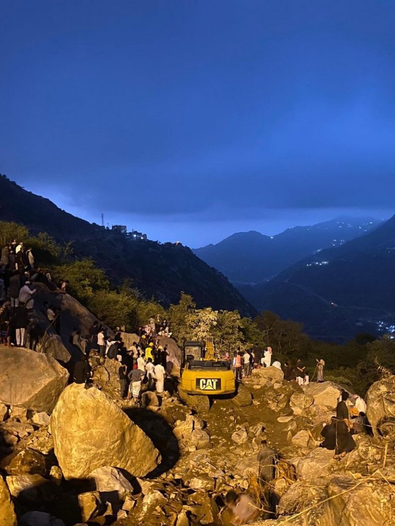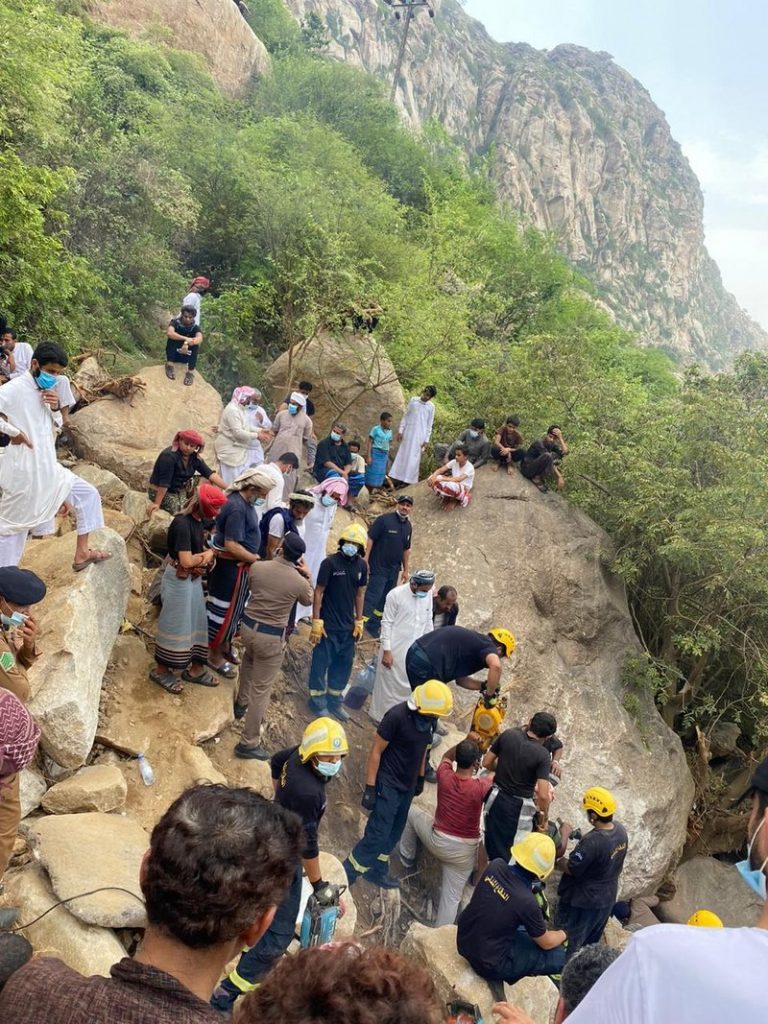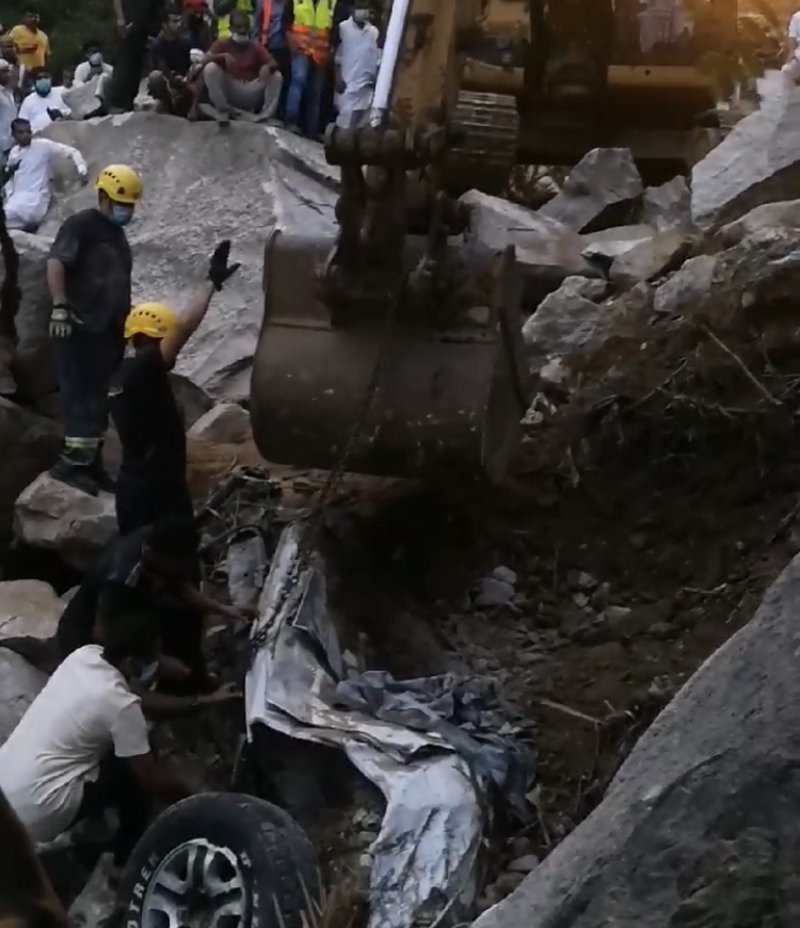 ورغم وعورة المنطقة الجبلية وصعوبة الوصول إلى الموقع واختفاء المركبة بفعل الطمر والصخور الضخمة؛ إلا أن الفِرَق المشاركة تمكنت خلال أكثر من 17 ساعة عمل متواصلة استمرت حتى المساء، من الوصول للضحايا بعد تكسير الصخور واستخدام الكشافات.