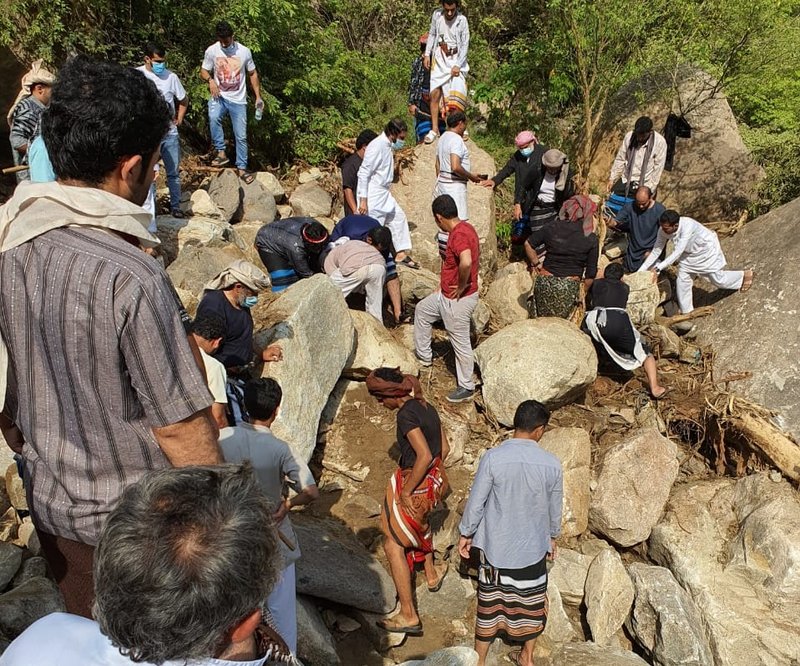 ورغم وعورة المنطقة الجبلية وصعوبة الوصول إلى الموقع واختفاء المركبة بفعل الطمر والصخور الضخمة؛ إلا أن الفِرَق المشاركة تمكنت خلال أكثر من 17 ساعة عمل متواصلة استمرت حتى المساء، من الوصول للضحايا بعد تكسير الصخور واستخدام الكشافات.