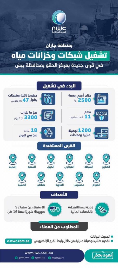 بدأت شركة المياه الوطنية ممثلة بالإدارة العامة لخدمات المياه بمنطقة جازان بتشغيل شبكات المياه بقرى مركز الحقو بمحافظة بيش ، حيث تم تشغيل خزان الحقو سعة 2500م3 وشبكات المياه بقرى ( القنازيز – السبطة – العيدابي – الحبيل – الشعبة ) بمركز الحقو بمحافظة بيش ، كما قامت الشركة بتحويل الضخ للقرى ( اللصبة – القوام – مخشوش – الغاويه – طناطن – المشبه ) على خزان الحقو بدلا من الابار . حيث تم تشغيل شبكات وخطوط ناقلة بأطوال بلغت 47 كم.طولي وعدد 1200 توصيلة منزلية ، لخدمة أكثر من 11,000 مستفيد بكمية مياه تصل الى 3300 م3/يوم وعدد ساعات ضخ يصل الى 18 ساعة باليوم.