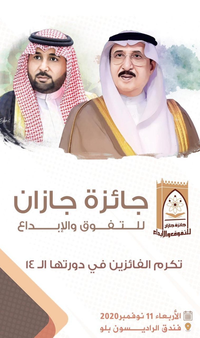 يرعى أمير منطقة جازان رئيس مجلس أمناء جائزة جازان للتفوق والإبداع الأمير محمد بن ناصر بن عبدالعزيز؛ حفل تسليم الجائزة في دورتها الرابعة عشرة، وذلك في الحادي عشر من نوفمبر القادم، بحضور نائب أمير منطقة جازان الأمير محمد بن عبد العزيز بن محمد بن عبد العزيز.