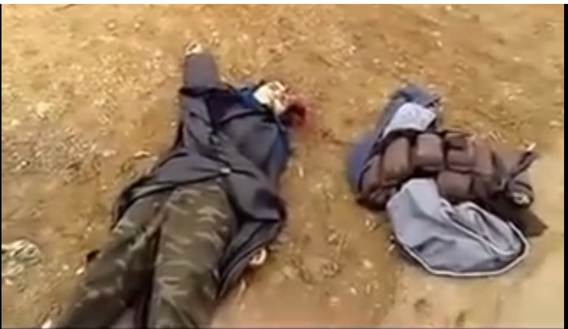 وتظهر بالفيديو امرأة مضرجة بدمائها وبجوارها حزام ناسف، قال أحد المتحدثين بالفيديو إنه هو من قام بتفكيكه من جسدها.