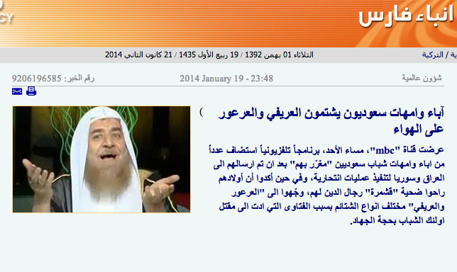 وعنونت الوكالة تقريرًا لها نشرته أمس بـ “أباء وأمهات سعوديون يشتمون العريفي والعرعور على الهواء”، جاء فيه أن قناة “mbc”، عرضت مساء الأحد، برنامجًا تلفزيونيًا استضاف عددًا من أباء وأمهات شباب سعوديين “مغرّر بهم” بعد أن تم إرسالهم إلى العراق وسوريا لتنفيذ عمليات انتحارية.