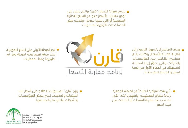 و”قارن”، هو برنامج لمقارنة الأسعار بين المنتجات والخدمات الأساسية، لتزويد المستهلك بأسعار عدد من المنتجات والخدمات الأساسية لدى بعض المؤسسات والشركات، لتسهيل الوصول إلى مقارنة عادلة للأسعار، ولرفع مستوى التنافس بين المؤسسات والشركات، لمصلحة المستهلك.