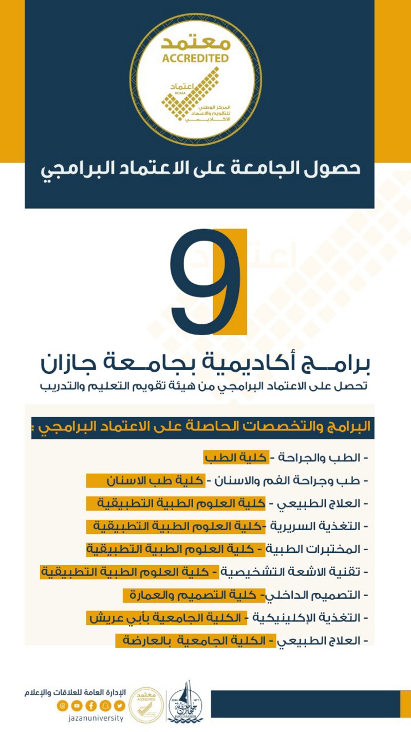 أعلن رئيس جامعة جازان الأستاذ الدكتور مرعي بن حسين القحطاني، حصول الجامعة عن اعتماد 9 برامج أكاديمية من هيئة تقويم التعليم والتدريب.