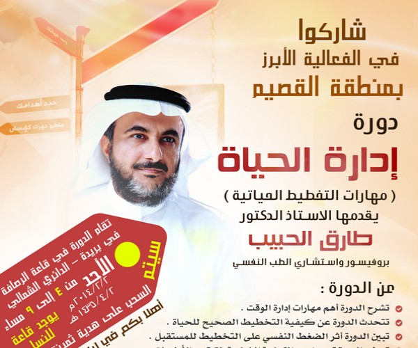 في أمسية جماهيرية كبيرة بمدينة بريدة بمنطقة القصيم يقدم د. طارق الحبيب، بروفيسور واستشاري الطب النفسي، إحدى أهم دوراته التدريبية تحت عنوان “إدارة الحياة.. مهارات التخطيط الحياتية”، وذلك يوم الأحد القادم الموافق 2/2/2014م، في قاعة الرصافة، على الدائري الشمالي ببريدة.