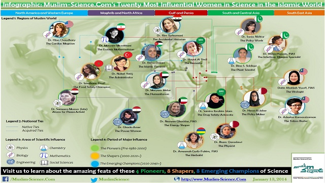 نشرت “Muslim-Scienc” قائمة من عشرين امرأة مسلمة ممن لعبن دورًا بارزًا في المجالات العلمية المختلفة في العالم الإسلامي، تم اختيارهن بعد تقييم دقيق للإنجازات العلمية التي وصلت إليها كل واحدة منهن خلال رحلتها المهنية. وكان لهن أثر في التطور العلمي والابتكارات العلمية في العالم الإسلامي.