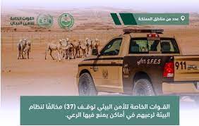 أوقفت القوات الخاصة للأمن البيئي (13) مخالفًا لنظام البيئة، (4) مواطنين و(9) مقيمين من الجنسيتين السودانية والهندية، ارتكبوا مخالفات رعي (317) رأسًا من الإبل و(85) رأسًا من الأغنام في أماكن يمنع فيها الرعي في عدد من مناطق المملكة.