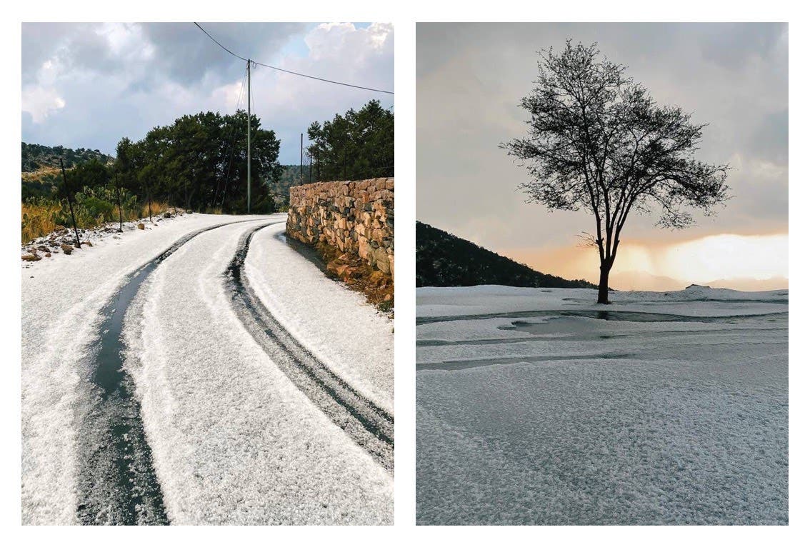 تلون جبل “دكا” في الشفا بالطائف غرب السعودية باللون الأبيض بعد هطول زخات من “البَرد” وبكميات كبيرة اكتست بها الجبال والطرق، وتكونت لوحة جمالية تمازجت مع خضرة أشجار العرعر.