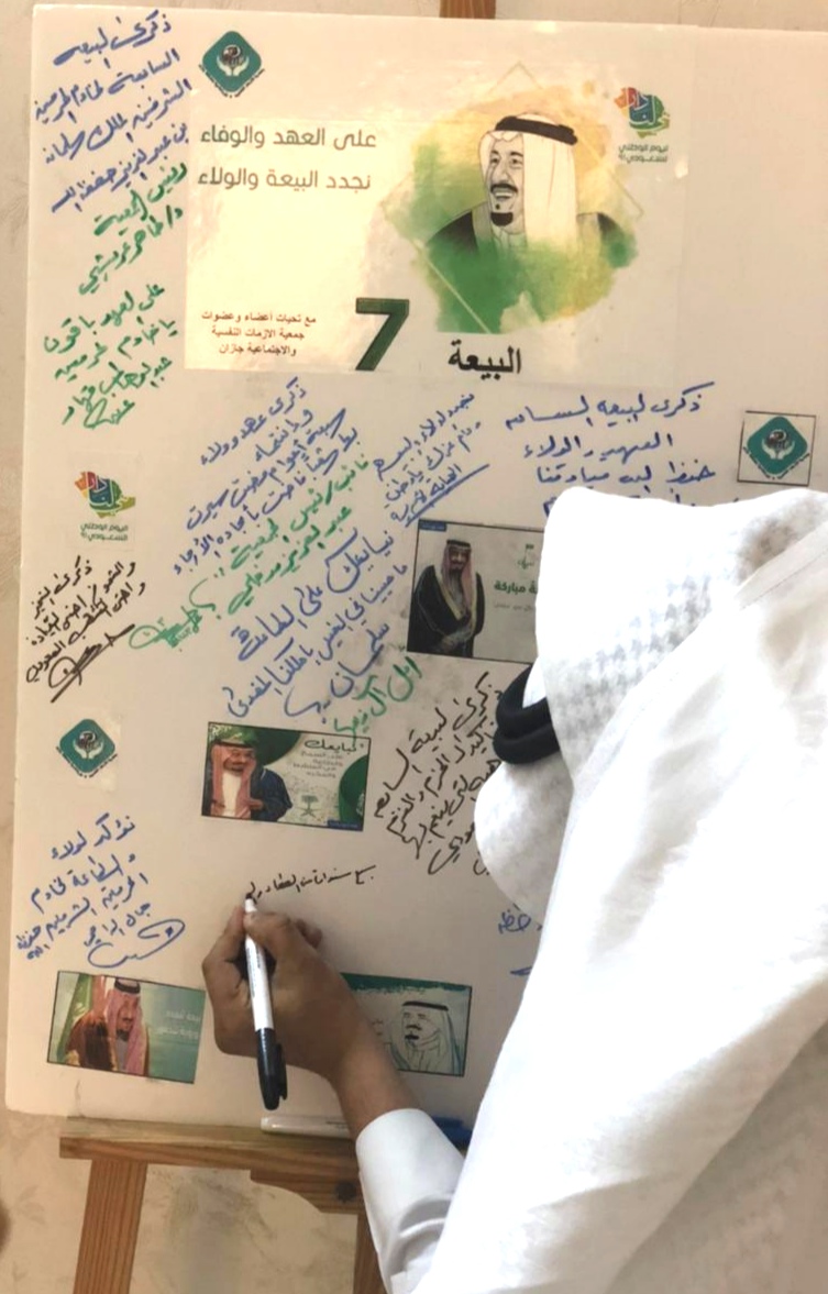 وأوضح رئيس الجمعية الدكتور طاهر بن شيبان عريشي، ان الفعالية نفذت وبحضور 18 جهة مشاركة مابين حكومية وغير ربحية والتي جاءت تزامناً مع ذكرى البيعة السابعة، كما خصصت الجمعية رُكناً خاصاً يشتمل على رسم لوحات وطنية تقوم عليه شابات سعوديات تتمثل في تجسيد صورة خادم الحرمين الشريفين .