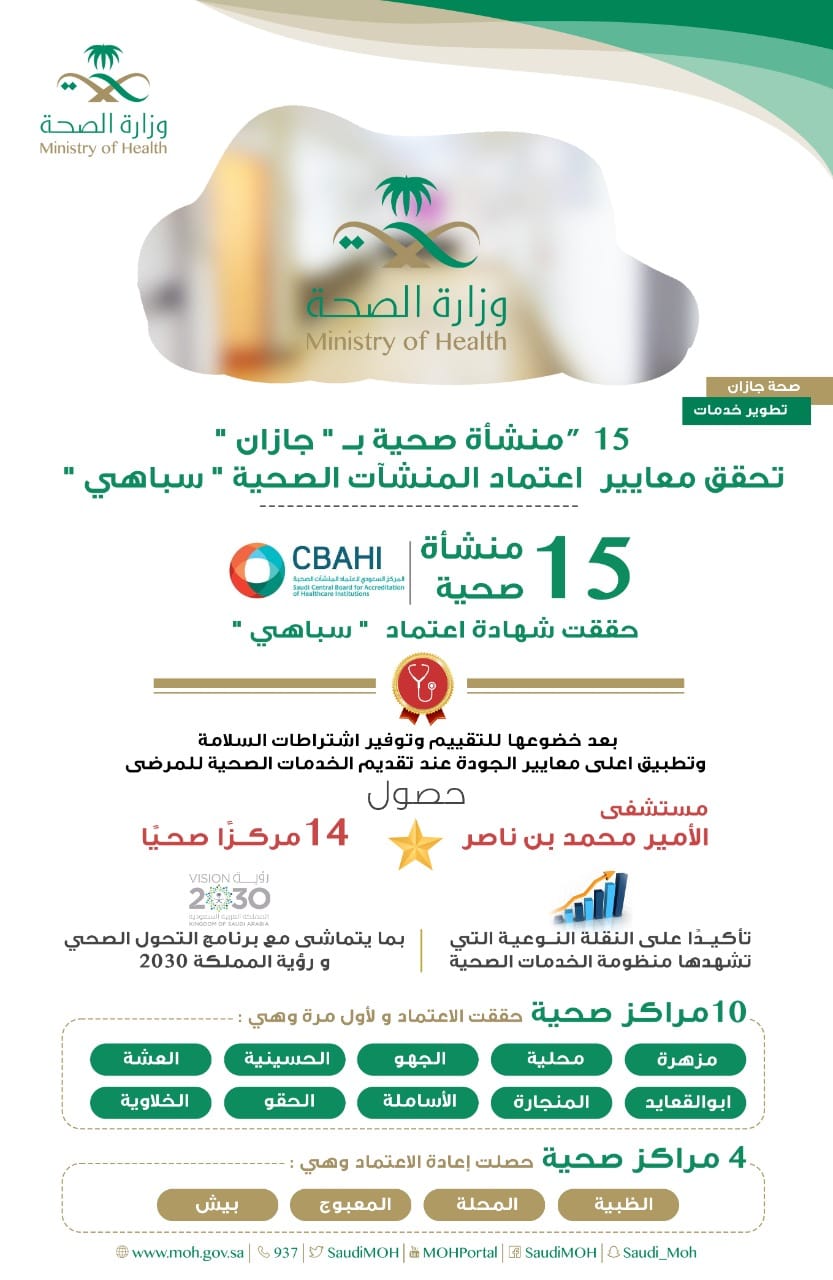 أوضحت صحة جازان بأن عدد 15 منشأة صحية حققت شهادة اعتماد ” سباهي ” والصادر عن المركز السعودي لإعتماد المنشآت الصحية وذلك بعد خضوعها للتقييم وتوفير اشتراطات السلامة وتطبيق أعلى معايير الجودة عند تقديم الخدمات الصحية للمرضى