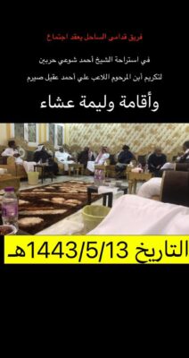 فريق قدمى نجوم الساحل ساحل الصوارمة والمرابي يعقد اجتماع في استراحة الشيخ احمد شوعي حربين لتكريم ابن المرحوم اللاعب علي احمد عقيل صيرم