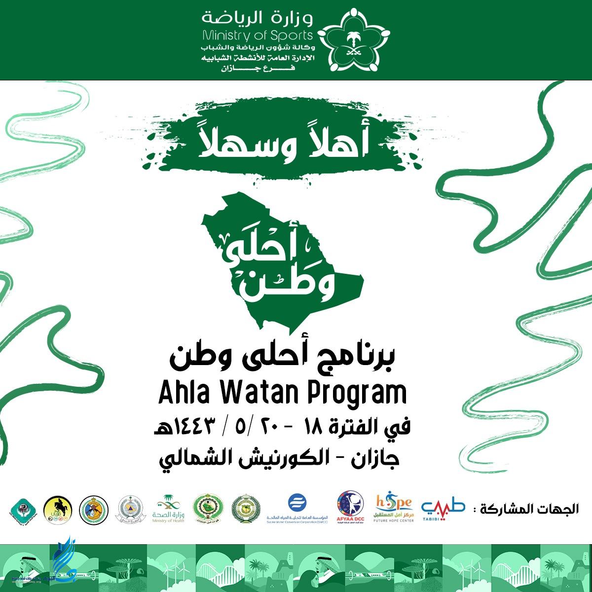 يُطلق فرع وزارة الرياضة بمنطقة جازان مساء غدٍ الأربعاء ، فعاليات برنامج ” أحلى وطن “، بإشراف وكالة شؤون الرياضة والشباب – الإدارة العامة للأنشطة الشبابية ، وذلك بالكورنيش الشمالي بمدينة جيزان.