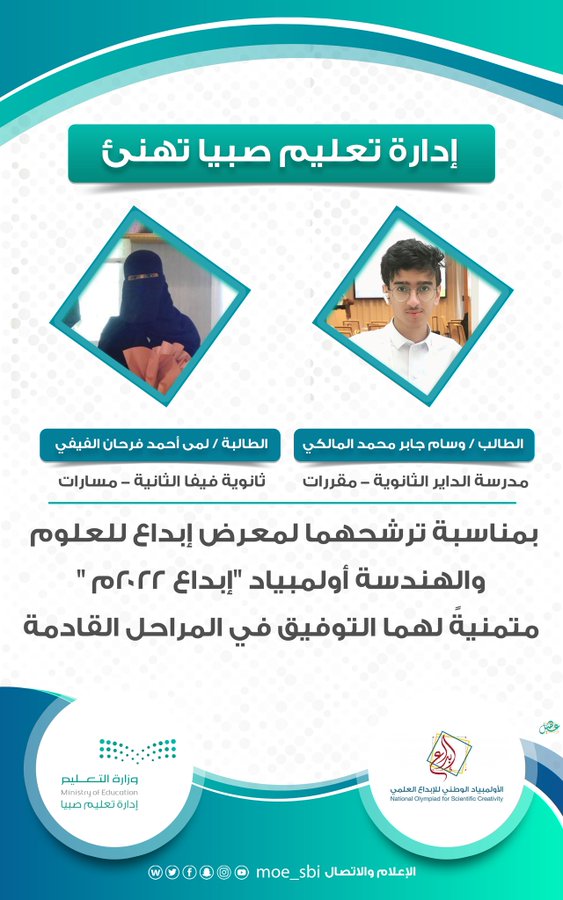 مدير تعليم صبيا د. حسن خرمي يبارك للطالب وسام المالكي والطالبة لمى الفيفي تأهلهما من بين أكثر من 8300 مشروع مسجل على مستوى المملكة وضمن 152 طالب وطالبة للتصفيات النهائية لمعرض إبداع للعلوم والهندسة ابداع 2022 متمنيا لهما التوفيق والسداد.