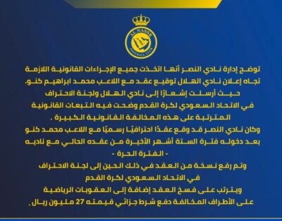 أصدر نادي النصر بيانا عاجلا بعد إعلان الهلال توقيع العقد مع اللاعب محمد كنو .