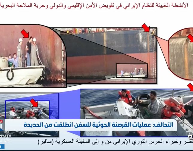وقال التحالف :” أنه بالعودة إلى ماقبل العام 2016 كانت السفينة العسكرية (تباندا) موجودة في منطقة العمليات حوالي 95 ميل من السواحل اليمنية” فيما استعرض مجموعة من الصور التي توثق أطقم عناصر الحرث الثوري الإيراني الإرهابي على متن السفينة .