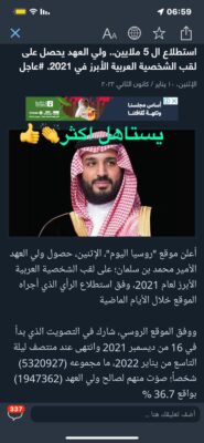 حصل ولي العهد السعودي، محمد بن سلمان على لقب الشخصية العربية الأبرز للعام 2021 وفق استطلاع الرأي الذي أجراه موقع RT.