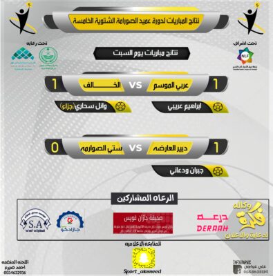 دورة عميد الصوارمة الخامسة نتائج مباريات اليوم عربي الموسم والخالف تعادل ايجابي ودبير العارضة يتغلب على ستي الصوارمة بهدف دون رد