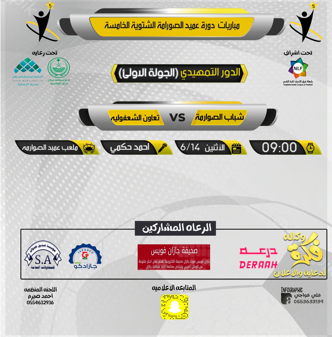 جازان الرياضية > ضمن دورة عميد الصوارمة شاهد طقم فريقي شباب الصوارمة و تعاون الشعفولية ضمن مباريات غدا الاثنين من الجولة الاولى