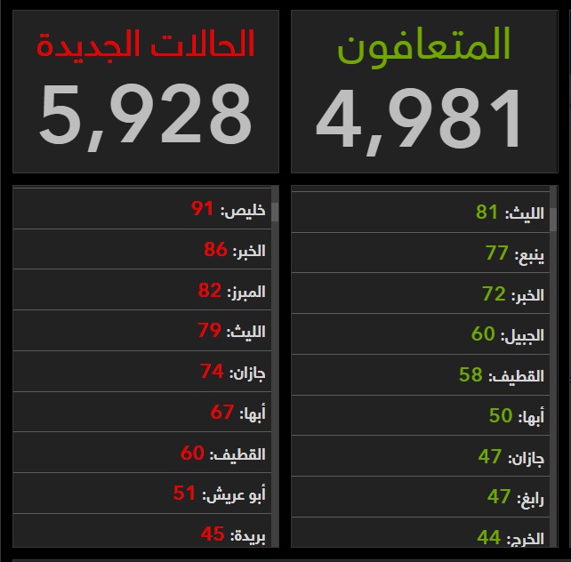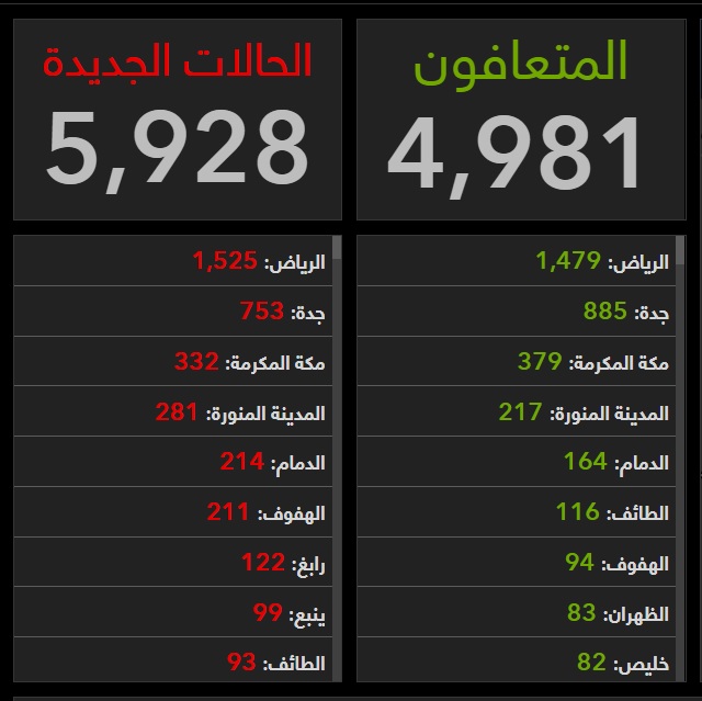 أما أعلى المدن تسجيلا لحالات التعافي فجاءت كما يلي: الرياض (1,479)، جدة (885)، مكة (379)، المدينة (217)، الدمام (164)، الطائف (116)، الهفوف (94).