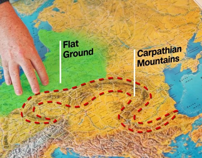 هناك سلسلة جبال تمتد عبر أوروبا، وجبال الكاربات. من بحر البلطيق هنا إلى حيث يبدأ الكاربات هناك، هذه أرض مستوية، ومن خلال تلك الأرض المسطحة جاء نابليون والفرنسيين وهتلر والألمان والعديد من الآخرين الذين غزوا روسيا من هذا الاتجاه، وهذا يجعل روسيا متوترة للغاية.