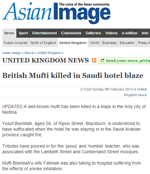 أكد موقع “أسيان إيماج” Asianimage البريطاني، وفاة يوسف بسم الله، مفتي المسلمين في بريطانيا، في الحريق الذي شبَّ في أحد الفنادق بالمدينة المنورة أمس السبت، ونتج عنه وفاة 13 وإصابة 130، وفقًا للبيان الذي أصدرته إمارة منطقة المدينة المنورة.