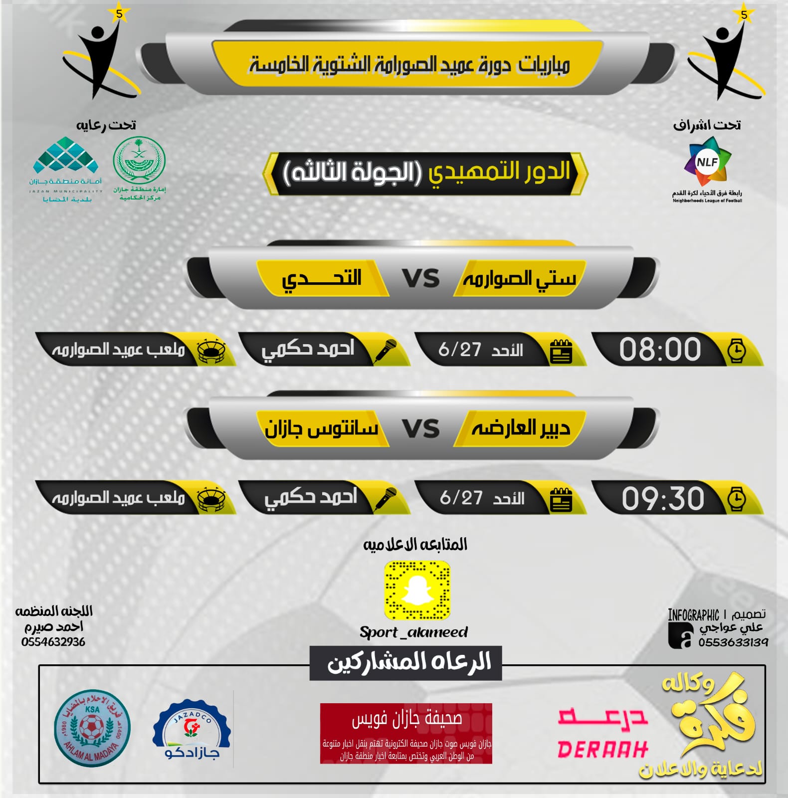 ضمن دورة عميد الصوارمة الشتوية الخامسة مباريارت الاحد 27/6/1443هـ تقام مباراتين