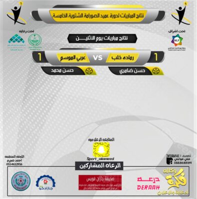 ضمن دورة عميد الصوارمة الشتوية الخامسة نتائج مباريات يوم الاثنين 28/6/1443 هـ