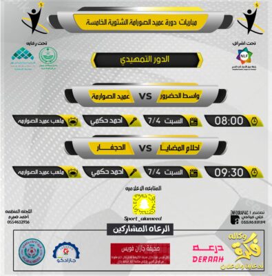 ضمن دورة عميد الصوارمة الشتوية الخامسة مباريات اليوم السبت 4/7/1443هـ