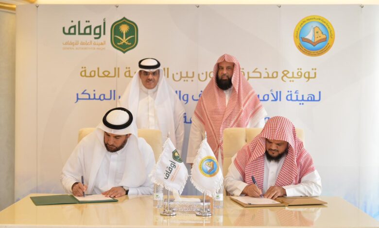 وقعت الرئاسة العامة لهيئة الأمر بالمعروف والنهي عن المنكر اليوم الأحد بديوان الرئاسة، اتفاقية تعاون مع الهيئة العامة للأوقاف، بحضور معالي الرئيس العام لهيئة الأمر بالمعروف والنهي عن المنكر الشيخ الدكتور عبد الرحمن بن عبد الله السند، وسعادة محافظ الهيئة العامة للأوقاف الأستاذ عماد بن صالح الخراشي.