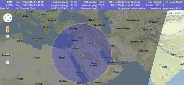 وأضاف: “تبين الصورة موقع القمر الصناعي لحظة سقوطه نحو الأرض في الساعة 04:41، ونلاحظ منها أن القمر الصناعي أصبح في ذلك الوقت داخل السعودية وأصبح مشاهداً في الأردن ومعظم أنحاء السعودية، أي أنه من المفترض أن هناك أشخاصاً في الأردن قد شاهدوا الحدث أيضاً في جهة الجنوب”.