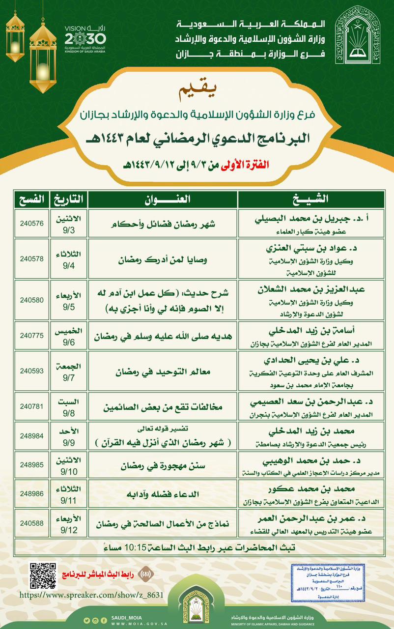 ينظم فرع وزارة الشؤون الإسلامية والدعوة والإرشاد في منطقة جازان البرنامج الدعوي الرمضاني الذي سيفتتحه مساء اليوم الإثنين الثالث من شهر رمضان ١٤٤٣ هجرية فضيلة الشيخ عضو هيئة كبار العلماء الاستاذ الدكتور جبريل بن محمد البصيلي بمحاضرة يتحدث فيها عن فضائل وأحكام شهر رمضان ، ثم يبين فضيلة وكيل الوزارة للشؤون الإسلامية الشيخ الدكتور عواد بن سبتي العنزي في اليوم الرابع بعض الوصايا لم ادرك شهر رمضان ، وفي اليوم الخامس يشرح فضيلة وكيل الوزارة لشؤون الدعوة والإرشاد الشيخ عبد العزيز بن محمد الشعلان حديث ( كل عمل ابن آدم له إلا الصوم فإنه لي وأنا أجزي به ) ، وفي اليوم السادس يوضح فضيلة مدير عام فرع الوزراة في جازان الشيخ أسامة بن زيد مدخلي هدي النبي صلى الله عليه وسلم في رمضان ، وفي اليوم السابع يذكر فضيلة المشرف العام على وحدة التوعية الفكرية بجامعة الأمام محمد بن سعود الدكتور علي بن يحيى الحدادي معالم التوحيد في رمضان ، وفي اليوم الثامن يلقي فضيلة مدير عام فرع الوزراة في نجران الدكتور عبد الرحمن بن سعد العصيمي محاضرته عن بعض المخالفات التي يقع فيها بعض الصائمين ، وفي اليوم التاسع يفسر فضيلة رئيس مجلس إدارة جمعية الدعوة والإرشاد وتوعية الجاليات بمحافظة صامطة الشيخ محمد بن زيد مدخلي قوله تعالى ( شهر رمضان الذي أنزل فيه القرآن ) ، ويتحدث فضيلة مدير مركز الإعجاز العلمي في القرآن والسنة الشيخ الدكتور حمد بن محمد الوهيبي في اليوم العاشر عن السنن المهجورة في رمضان ، ويتحدث فضيلة الشيخ محمد بن محمد عكور الداعية المتعاون بفرع الوزارة في جازان في اليوم الحادي عشر عن فضل الدعاء وخاصة في ساعات الاستجابة وقت الإفطار .