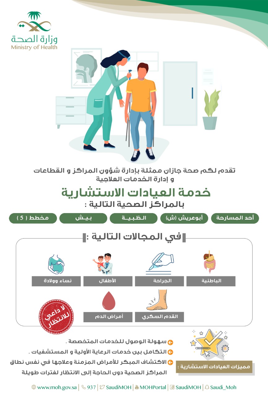 وتم إطلاق العيادات الاستشارية في عدد ” 5 ” مراكز صحية منتشرة كمركز صحي أحد المسارحة ، ومركز صحي أبو عريش الشمالي ، ومركز الظبية بمحافظة صبيا ، ومركز صحي بيش، إضافة الى مركز صحي مخطط 5 بمدينة جيزان ، يضم كل مركز فيها عدد ” 6 ” عيادات تعمل على تقديم خدماتها العلاجية في تخصصات الجراحة العامة والباطنية والأطفال والنساء والولادة والقدم السكري وأمراض الدم ، إذ بإمكان المستفيدين الحصول على الموعد والاستفادة منها عبر تطبيق ” صحتي ”