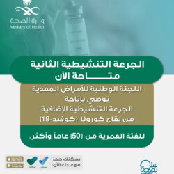 أعلنت وزارة الصحة أن مواعيد حجز الجرعة “التنشيطية الثانية” من لقاح كورونا متاحة لمن يرغب من الفئة العمرية (50) عاماً فأكثر، وذلك لمن أتم (8) أشهر على أخذ الجرعة التنشيطية الأولى.
