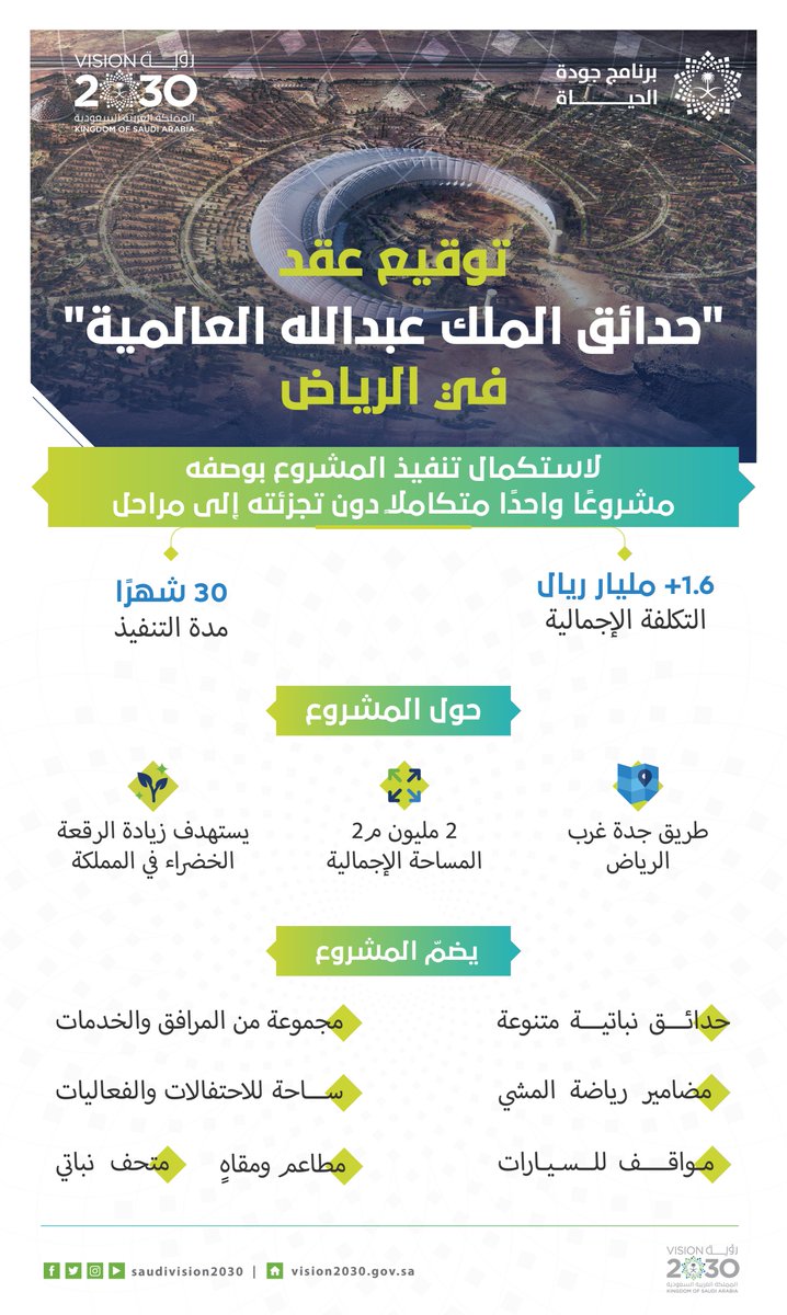 وينسجم مشروع حدائق الملك عبدالله العالمية، الذي تبلغ مساحته الإجمالية مليوني متر مربع، مع برنامج تحسين جودة الحياة، وهو أحد برامج رؤية المملكة 2030، وفقاً لما ذكرته وكالة الأنباء السعودية “واس