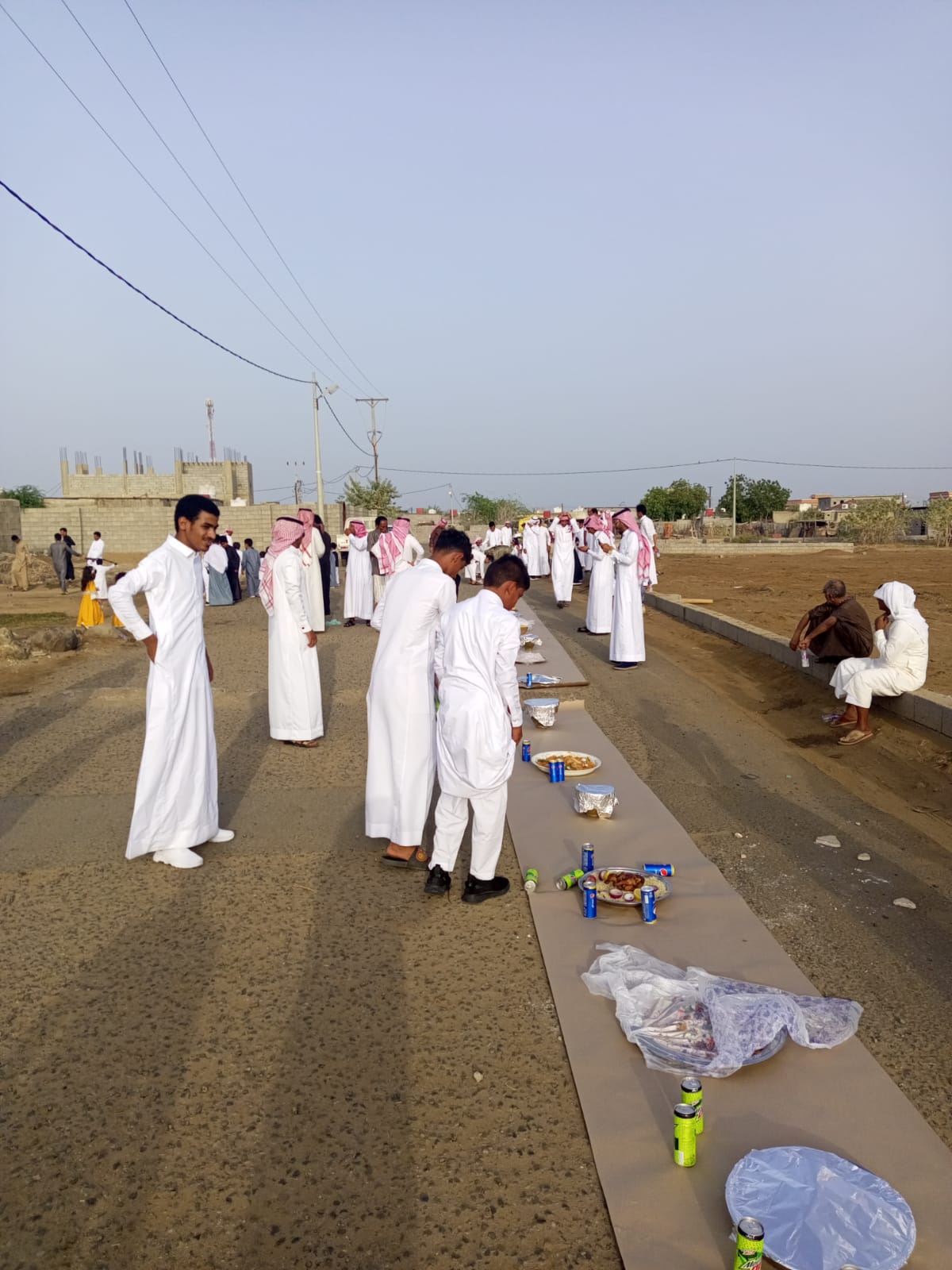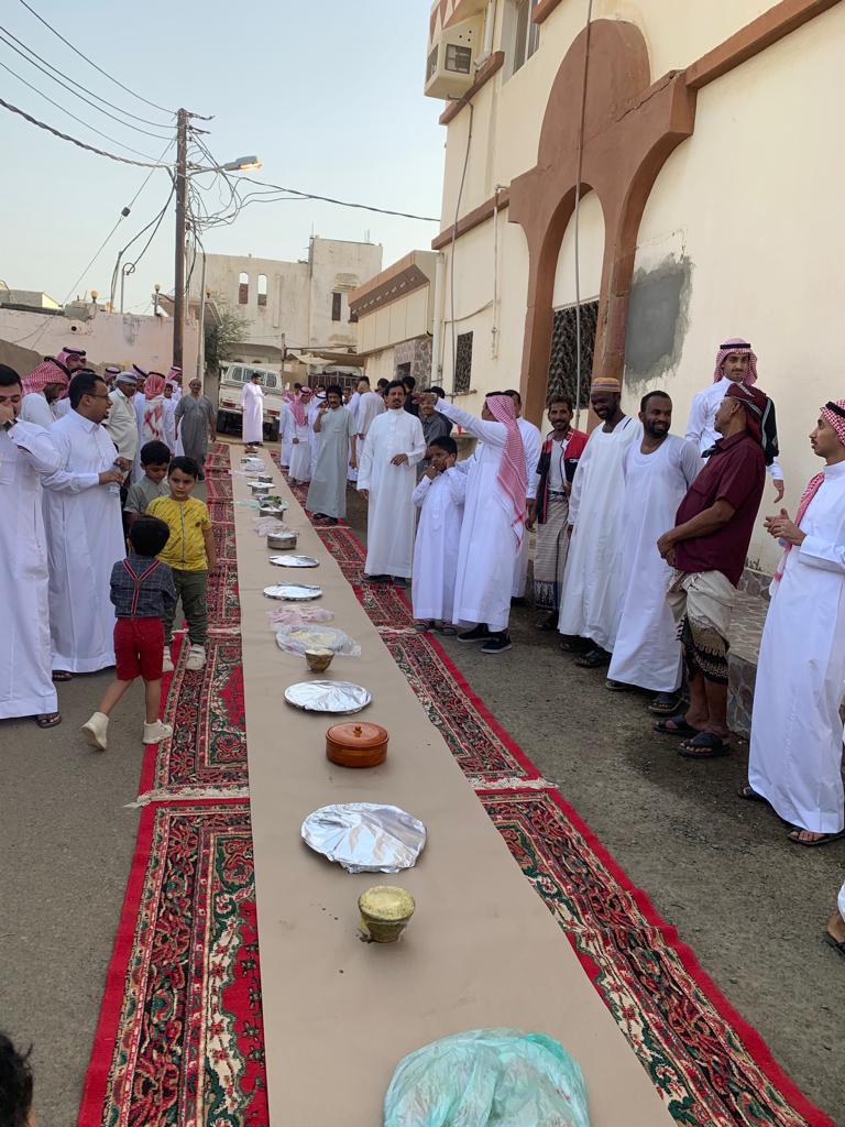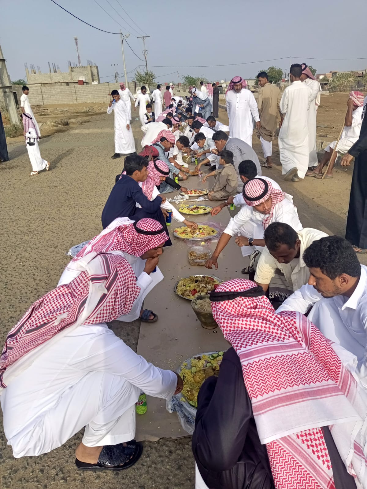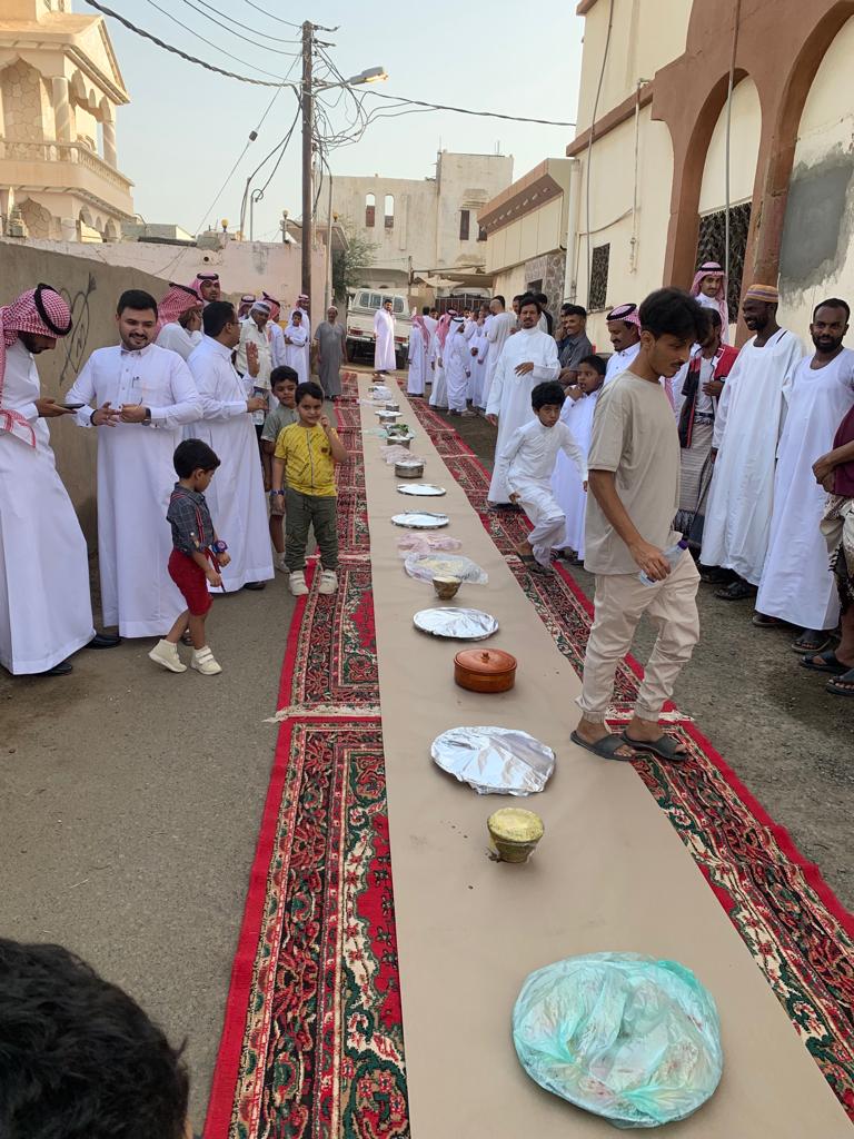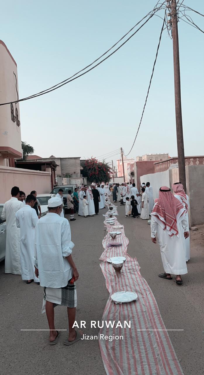 - منذ القديم اعتاد أبناء منطقة جازان خاصة ومنطقة الجنوب بتميز أعيادهم بعادات توارث أبنائها جيل بعد جيل وهي حلقة يجتمع فيها أبناء الحي أو الحارة أو القرية كلا يأتي بطعامه معه لتكون سفرة يجتمع عليها الأهل والجيران في صورة إجتماعية تدل على اللحمة والتقارب يتبادلون خلالها التحية والمعايدة فيما بينهم