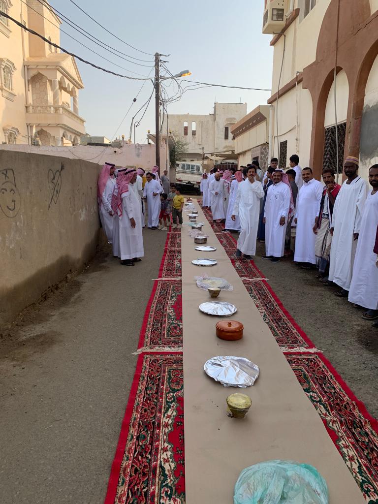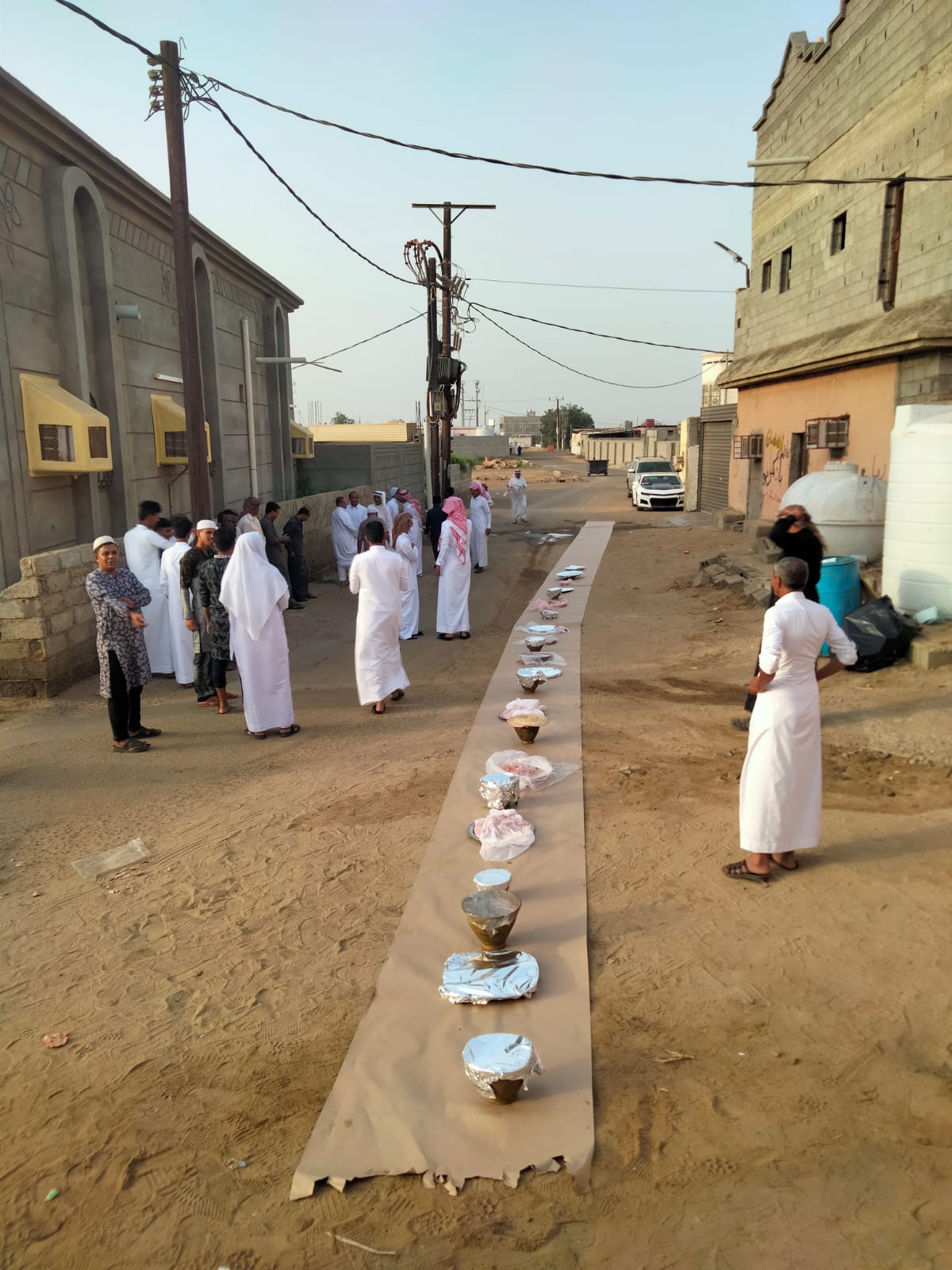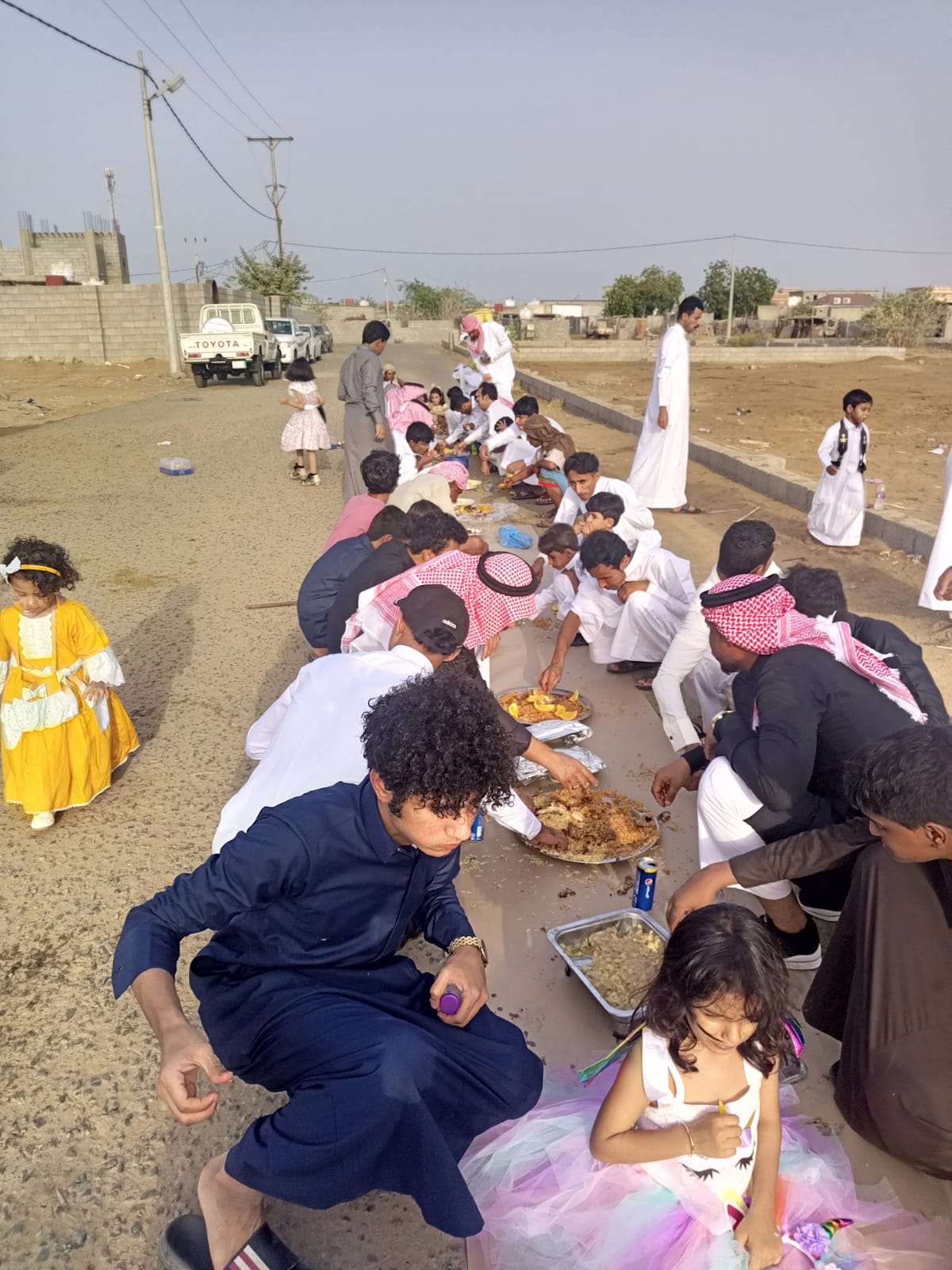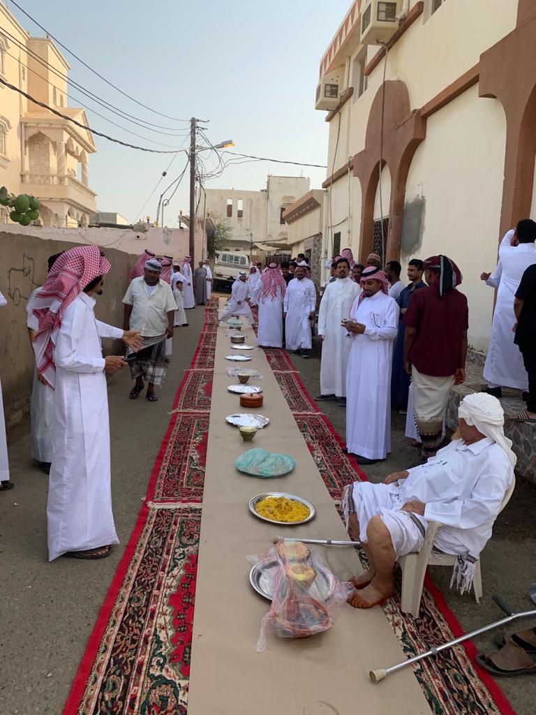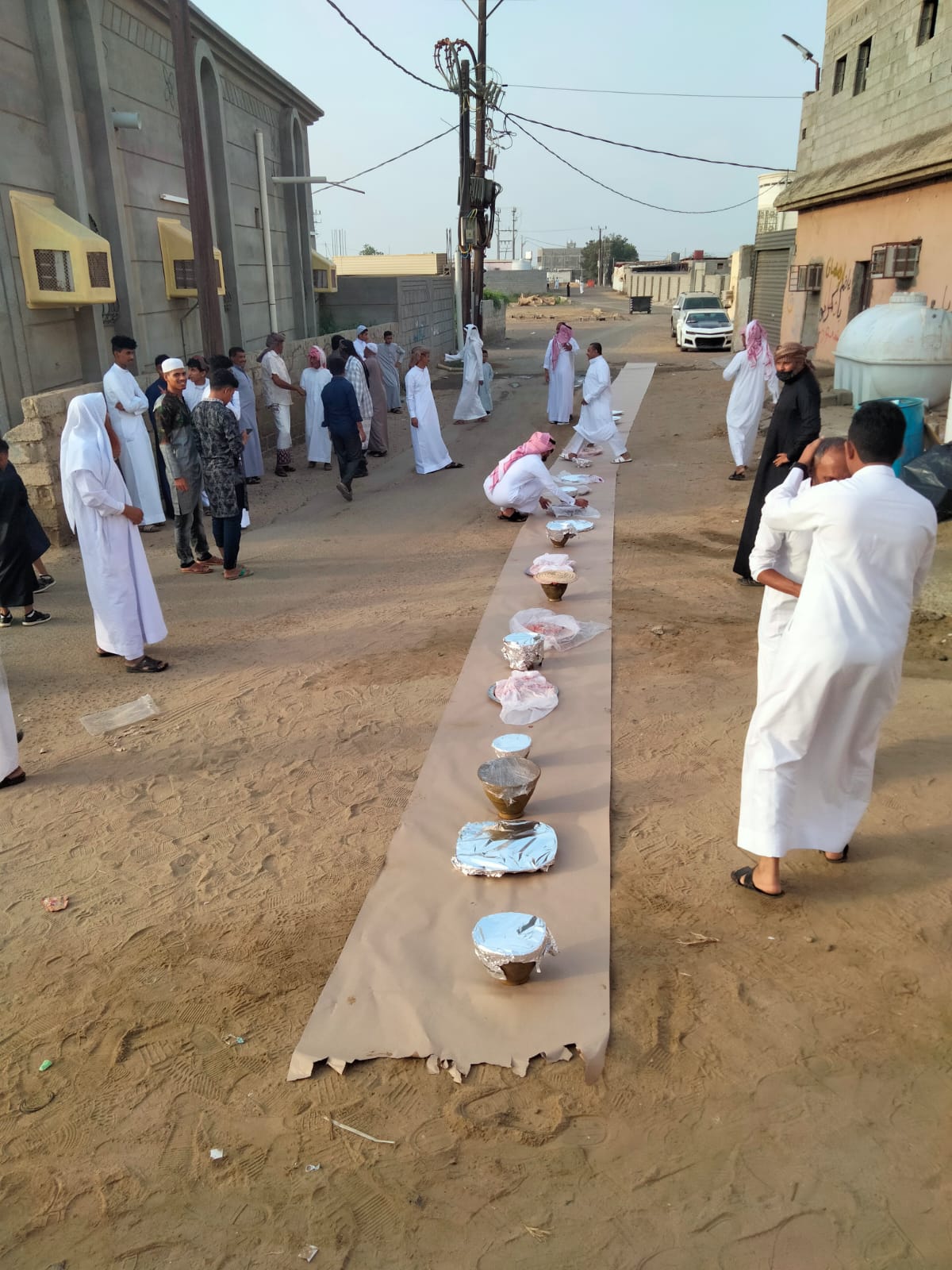 - منذ القديم اعتاد أبناء منطقة جازان خاصة ومنطقة الجنوب بتميز أعيادهم بعادات توارث أبنائها جيل بعد جيل وهي حلقة يجتمع فيها أبناء الحي أو الحارة أو القرية كلا يأتي بطعامه معه لتكون سفرة يجتمع عليها الأهل والجيران في صورة إجتماعية تدل على اللحمة والتقارب يتبادلون خلالها التحية والمعايدة فيما بينهم