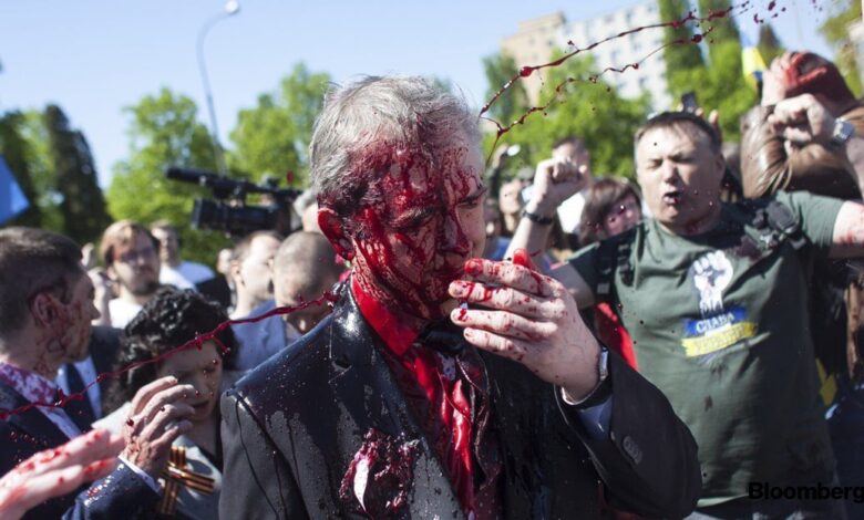 تعرض سفير روسيا في وارسو الاثنين للرش بمادة حمراء من قبل نشطاء مؤيدين لأوكرانيا عندما حاول وضع إكليل من الزهر احتفالاً بيوم النصر في 9 أيار/مايو لإحياء ذكرى هزيمة ألمانيا النازية في الحرب العالمية الثانية.