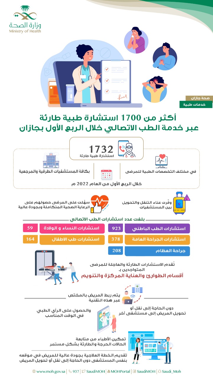 قالت الصحة في جازان بأن خدمة الطب الاتصالي قدمت أكثر من 1732 استشارة طبية طارئة في مختلف التخصصات الطبية للمرضى بكافة المستشفيات الطرفية والمرجعية وذلك خلال الربع الأول من العام الحالي 2022 م .