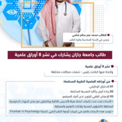 شارك الطالب بالسنة السادسة بكلية الطب بجامعة جازان محمد عمر سالم شامي في نشر ٨ أوراق علمية، واحدة منها كباحث رئيس، في مختلف المجلات العلمية الطبية المحكمة.