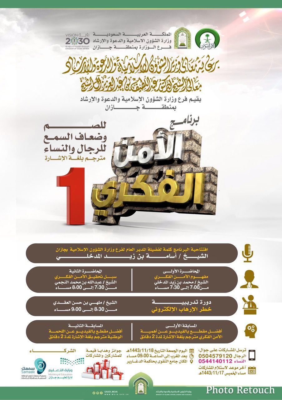 يقيم فرع وزارة الشؤون الإسلامية والدعوة والإرشاد في منطقة جازان مساء الجمعة الثامن عشر من شهر ذي القعدة ١٤٤٣ هجرية برنامج الأمن الفكري الأول للصم وضعاف السمع من الرجال والنساء والذي يأتي برعاية من لدن معالي الوزير الشيخ الدكتور عبد اللطيف بن عبد العزيز آل الشيخ ، حيث سيفتتح فضيلة مدير عام الفرع الشيخ أسامة بن زيد مدخلي البرنامج بكلمه يتحدث فيها عن أهمية الأمن الفكري وماهي الطرق السليمة لتحقيق ذلك كما سيبين جهود المملكة العربية السعودية بقيادة خادم الحرمين الشريفين الملك سلمان بن عبد العزيز في الحفاظ على عقول أبناء وبنات الوطن وحمايته من الانجراف نحو تيارات الفكر الضال ويوضح أن فئة الصم وضعاف السمع من الفئات الغالية على قلوبنا ويجب علينا حماية أفكارهم وعقولهم وبيان اعتدال هذا الدين الحنيف ، ثم ستقام محاضرتين الأولى يلقيها فضيلة الشيخ محمد بن زيد مدخلي عن مفهوم الأمن الفكري والثانية لفضيلة الشيخ عبد الله بن محمد نجمي يتحدث عن ( سبل تحقيق الأمن الفكري ) .