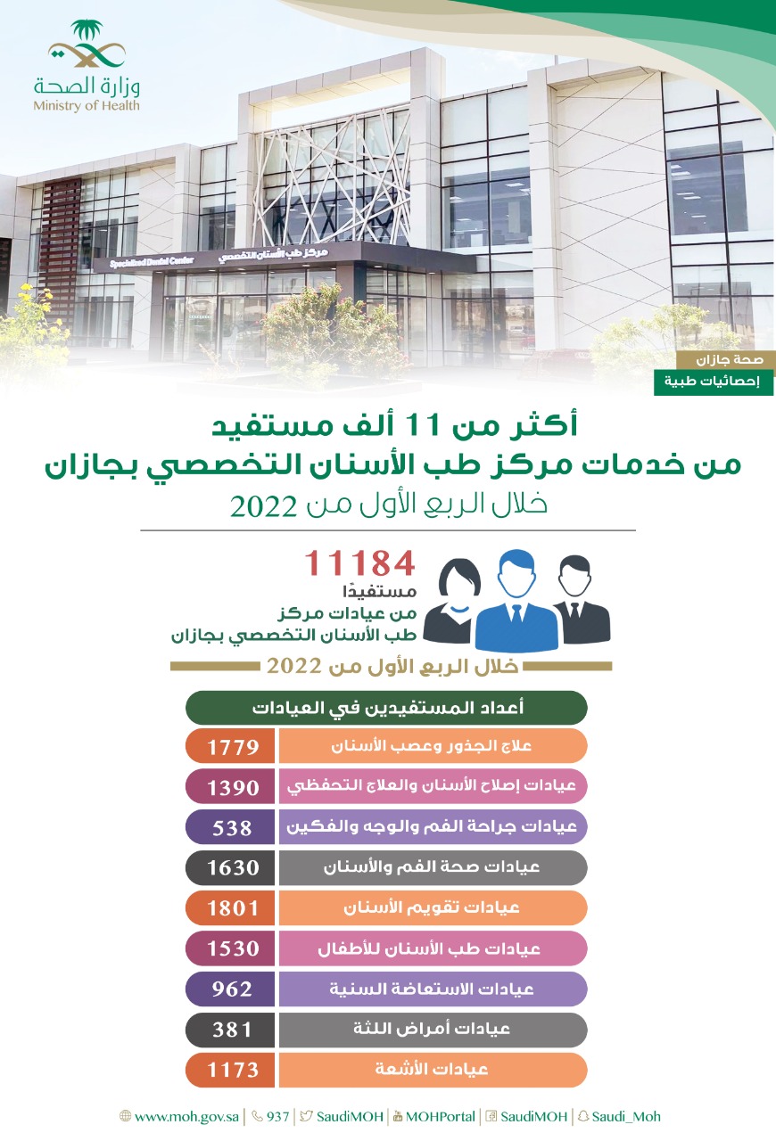 قالت صحة جازان بأن عيادات مركز طب الأسنان التخصصي التابع لها استقبلت 11184 مستفيدًا خلال الربع الأول من العام الحالي 2022م.