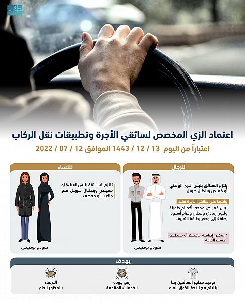 أعلنت الهيئة العامة للنقل دخول قرار اعتماد الزي المخصص لسائقي الأجرة العامة وأجرة المطار والأجرة الخاصة، وكذلك سائقي تطبيقات نقل الركاب حيز التنفيذ والتطبيق ابتداءً من اليوم الثلاثاء، وذلك وفقًا لما نشرته الهيئة في إعلانها في وقت سابق من شهر مايو الماضي.