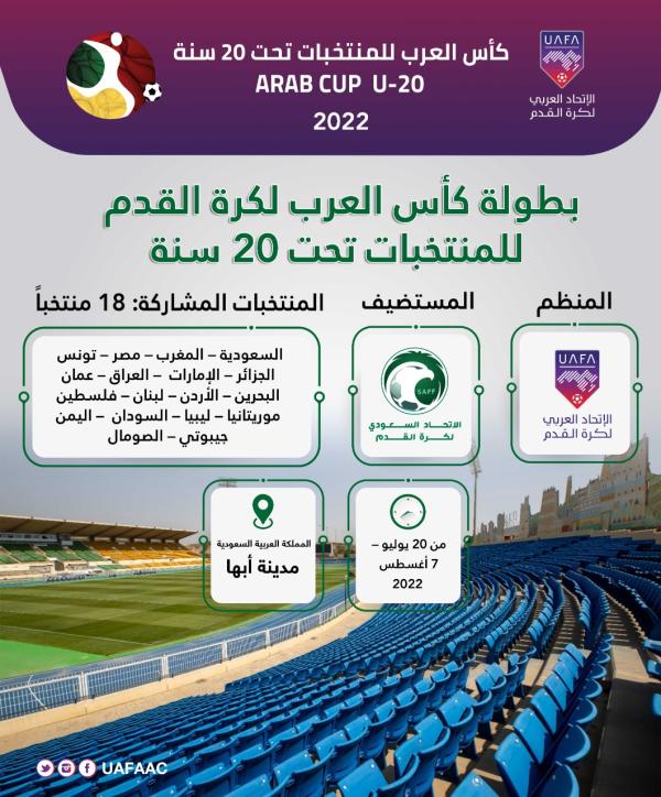 تستضيف المملكة العربية السعودية في مدينة أبها ومحافظة خميس مشيط منافسات النسخة الثامنة من بطولة كأس العرب لكرة القدم للمنتخبات تحت 20 عاما، التي ينظمها الاتحاد العربي لكرة القدم، ويستضيفها الاتحاد السعودي خلال المدة من 20 يوليو الحالي حتى 6 أغسطس المقبل، بمشاركة 18 منتخبا.