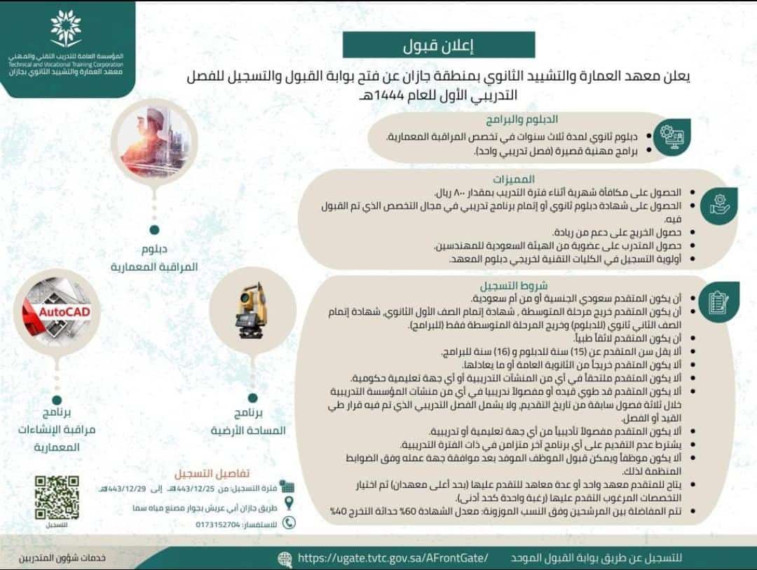 يعلن معهد العمارة و التشييد الثانوي بمنطقة جازان عن فتح باب القبول والتسجيل الإلكتروني للراغبين في التقديم على برامج المعهد في جميع أقسامه لمرحلتَيْ الدبلوم والبرامج التدريبية الفصلية، مطلع الفصل التدريبي الأول للعام التدريبي 1444هـ .