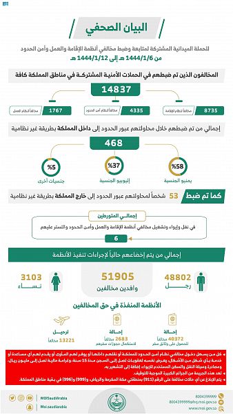 أسفرت الحملات الميدانية المشتركة لمتابعة وضبط مخالفي أنظمة الإقامة والعمل وأمن الحدود، التي تمت في مناطق المملكة كافة، وذلك للفترة من 6 حتى 12 / 1 / 1444هـ الموافق 4 ـ 10 / 8 / 2022م عن النتائج التالية: