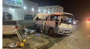 باشرت فِرق هيئة الهلال الأحمر السعودي بمنطقة جازان مساء الأحد حادث تصادم بين باص ومركبة بعد إشارة المعبوج باتجاه إشارة محلية؛ ما أدى إلى وقوع حالتَي وفاة، و15 إصابة، منها 3 حالات حرجة، و5 حالات متوسطة، و7 حالات طفيفة.