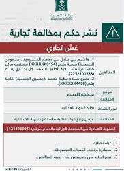 شهرت وزارة التجارة بمنشأة تختص في تجارة المواد الغذائية بعد صدور حكم قضائي بإدانة صاحب المنشأة والبائع بمخالفة نظام مكافحة الغش التجاري إثر عرض وبيع مواد غذائية فاسدة ومنتهية الصلاحية.
