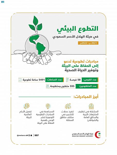 نجحت هيئة الهلال الأحمر السعودي في توفير 58 فرصة تطوعية للمحافظة على البيئة منذ بداية يناير 2021 وحتى نهاية سبتمبر 2022، شارك فيها 595 متطوعا ومتطوعة من مختلف مناطق المملكة، بإجمالي عدد ساعات تطوعية بلغت 5491 ساعة.